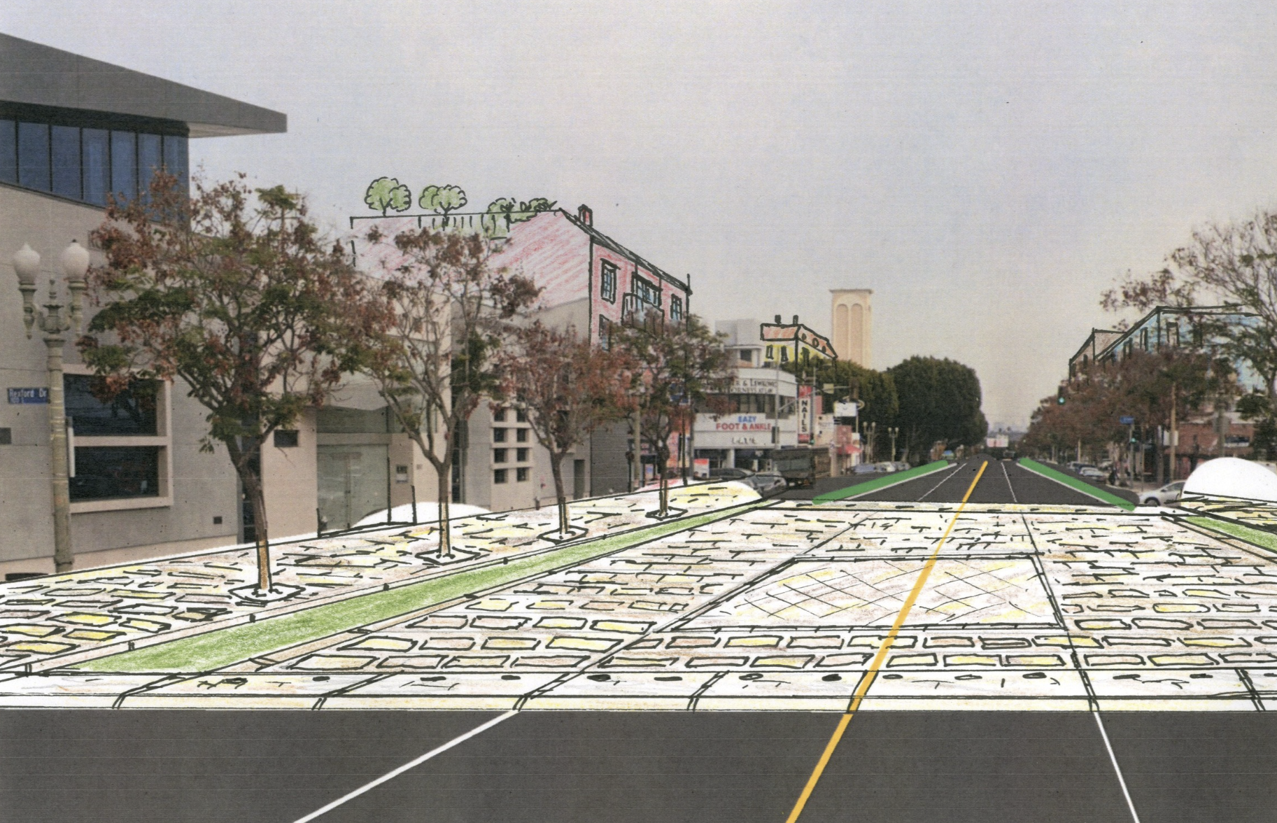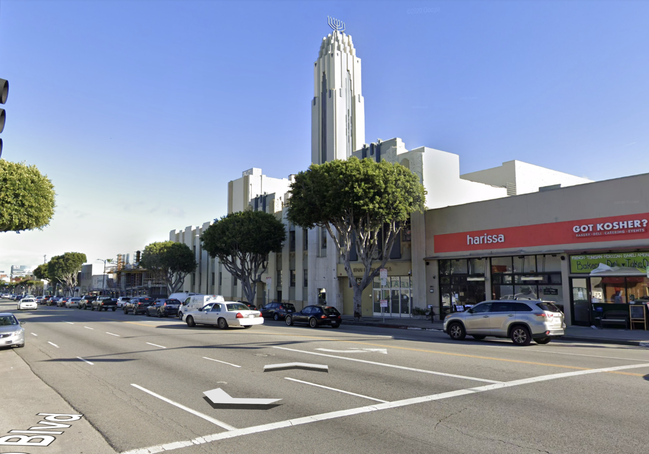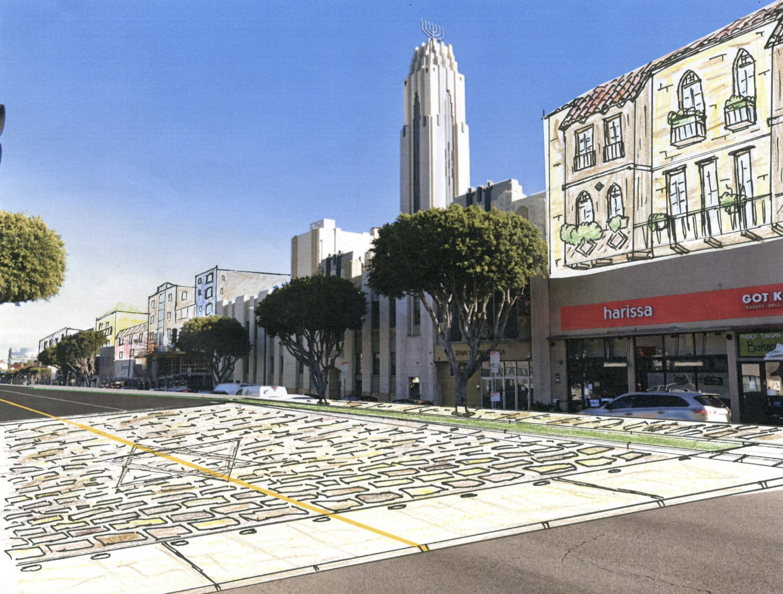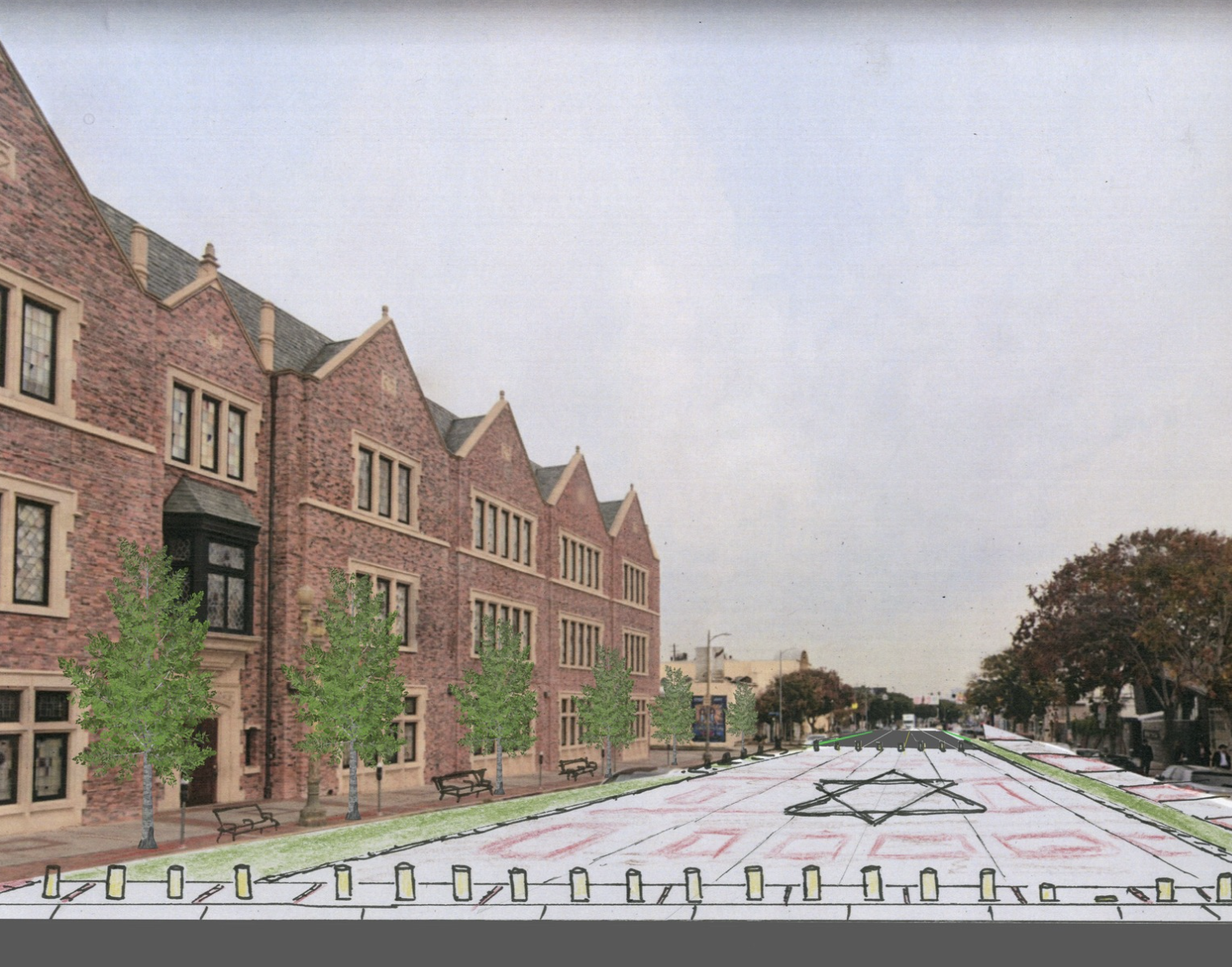 One of the biggest challenges in Pico-Robertson is a lack of public space. The city of Los Angeles already owns the broad boulevards here, so we had an idea—what if the streets could become the public space? Using retractable bollards and stone pavers, the streetscape can instantly transform from a thoroughfare to a public plaza. We suggest the bollards go up on weekends, when through traffic is at a minimum and local synagogues host large crowds of worshippers.