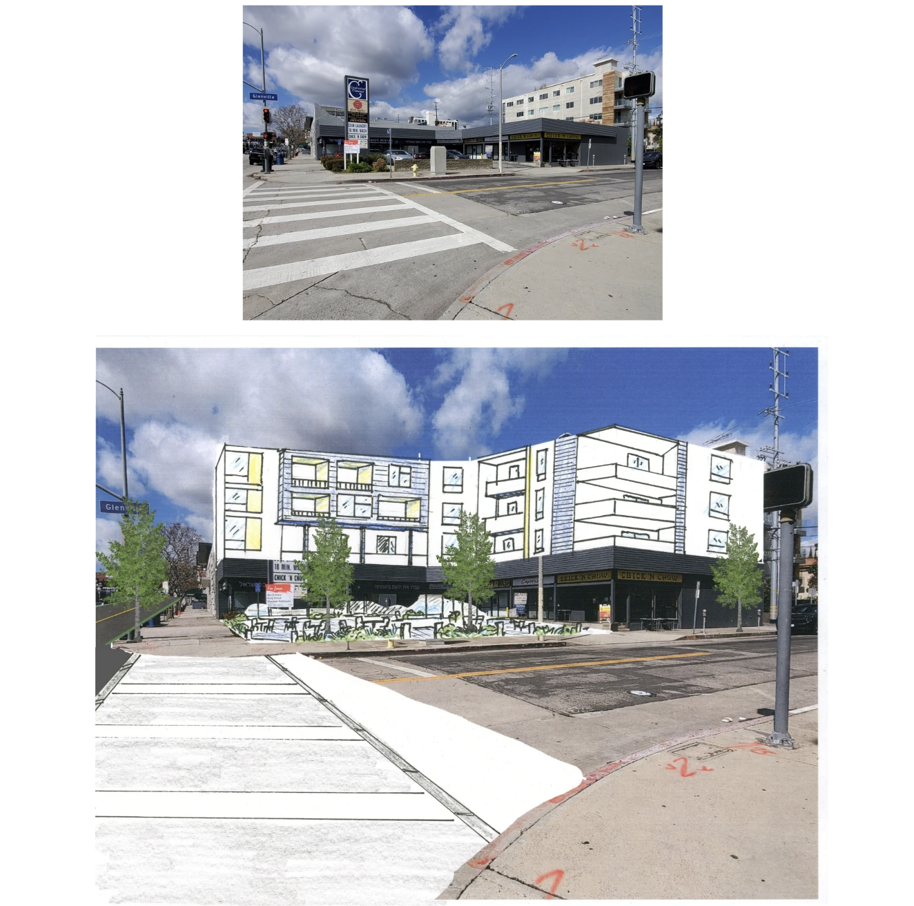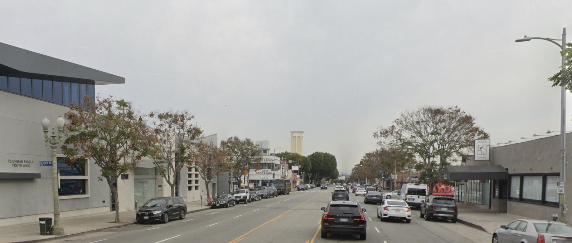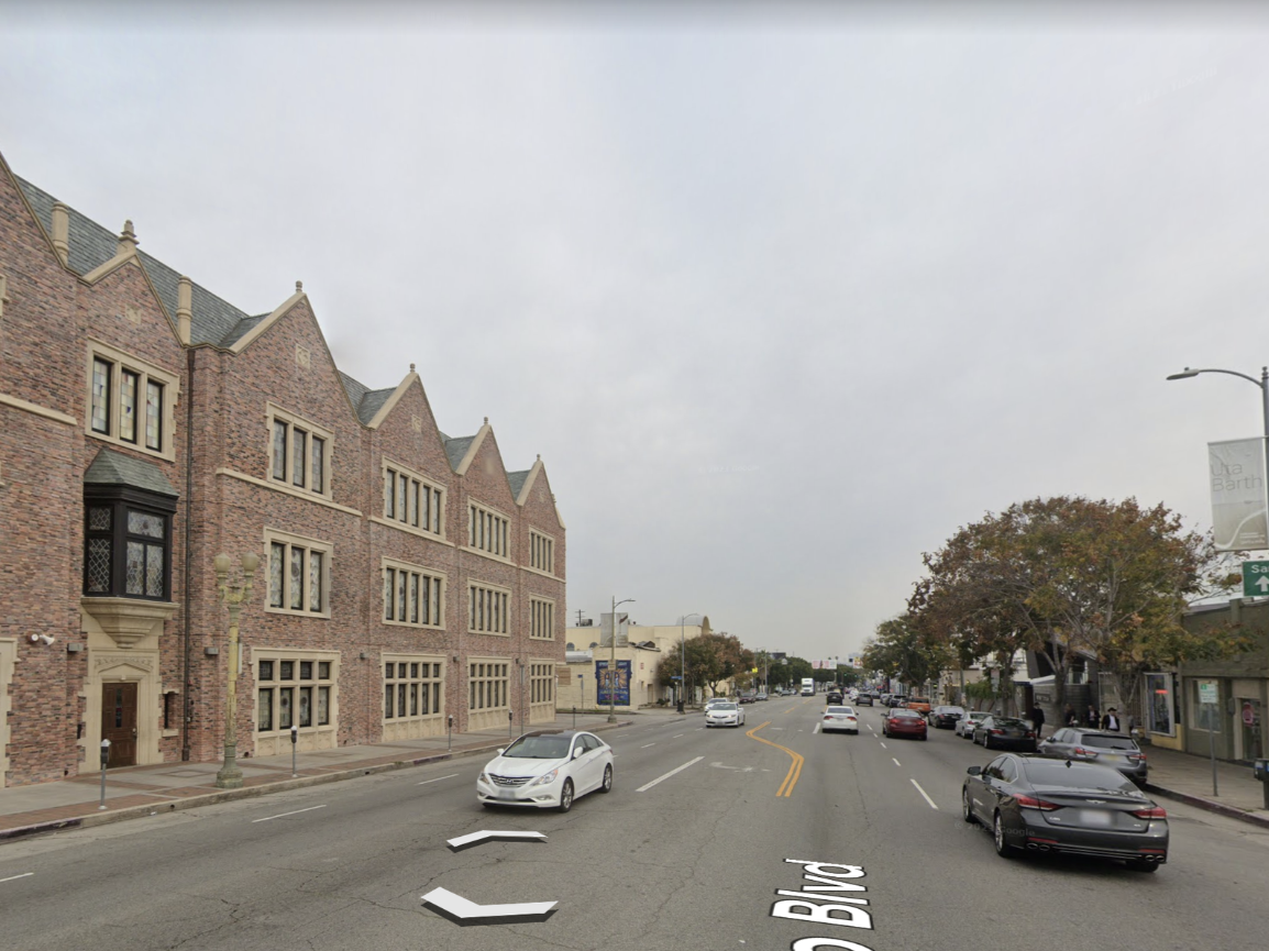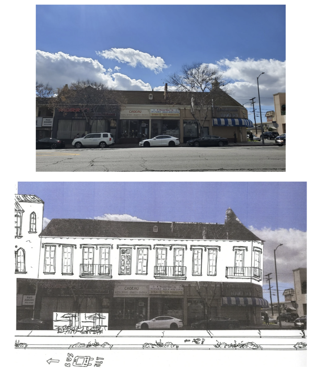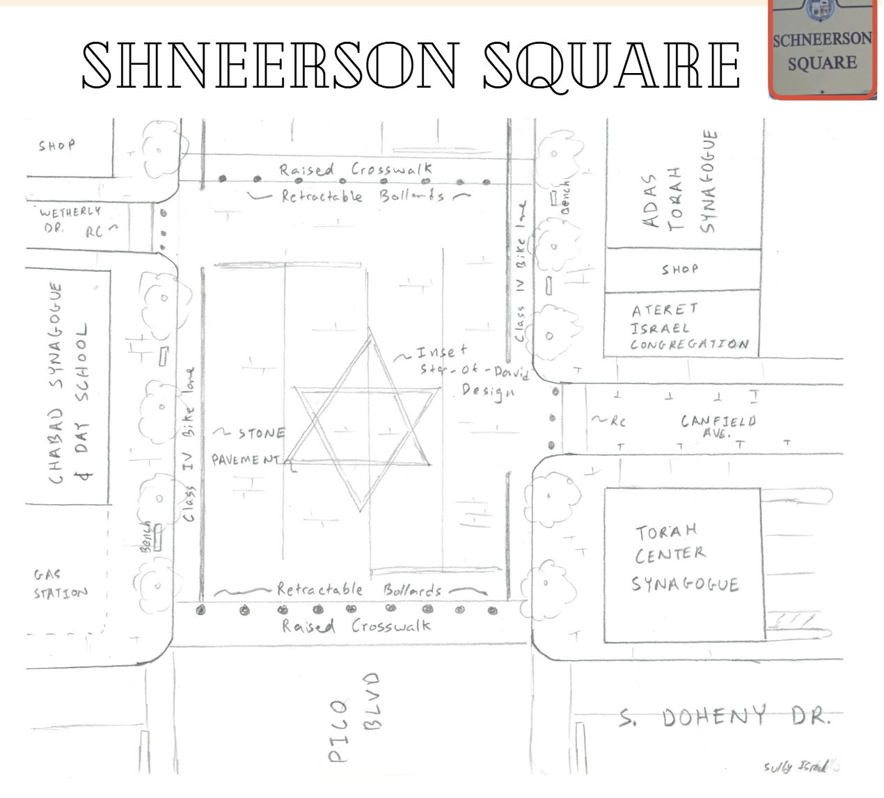 One of the biggest challenges in Pico-Robertson is a lack of public space. The city of Los Angeles already owns the broad boulevards here, so we had an idea—what if the streets could become the public space? Using retractable bollards and stone pavers, the streetscape can instantly transform from a thoroughfare to a public plaza. We suggest the bollards go up on weekends, when through traffic is at a minimum and local synagogues host large crowds of worshippers.