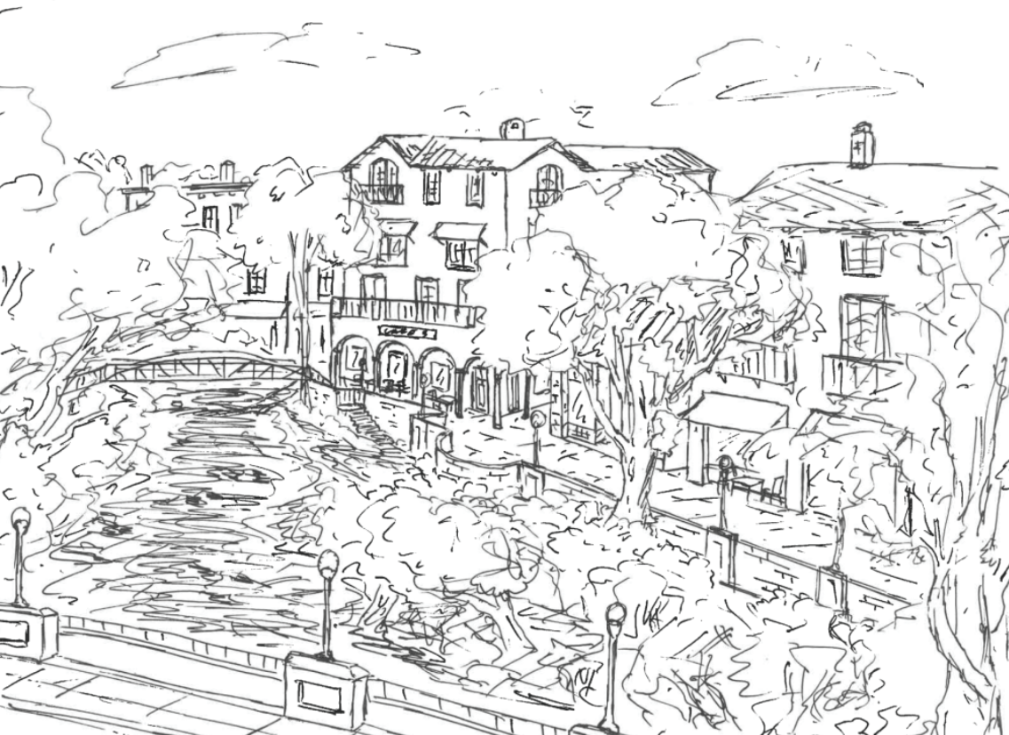 The class split the existing downtown into sub areas, with small teams working on each. I worked on the historic core, anchored by the historic City Hall, built in 1914, and sunken garden. Today, two sides of this park are lined with parking lots and small commercial buildings. In the image above, I reimagine the space framed with multi-story mixed use structures, fronted by a public arcade. I created all the artwork shown on this page.