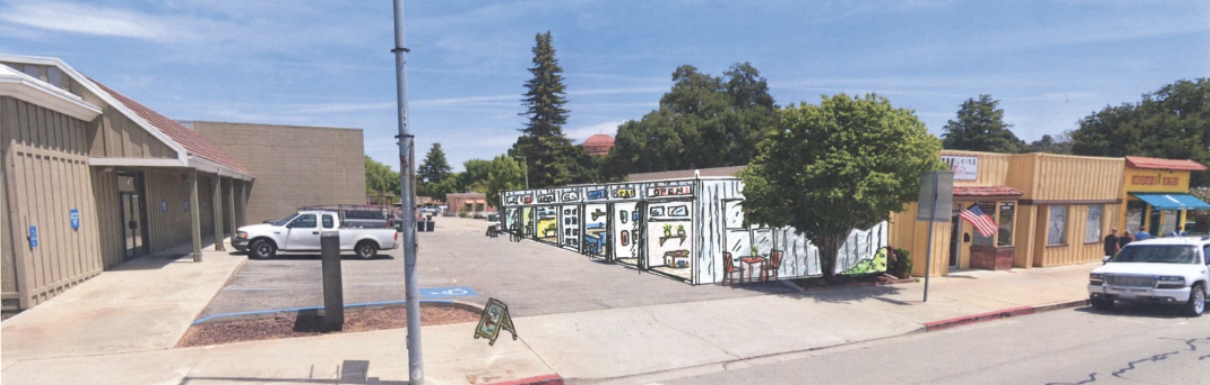 These images imagine a phased approach to revitalization in Downtown. Starting with a small investment in a converted shipping container on a city-owned lot, this space can serve as a “business incubator,” slowly building up over time with more permanent structures. The final design is a “Grand Paseo” that serves as a marketplace, while retaining small shop spaces for entrepreneurs.